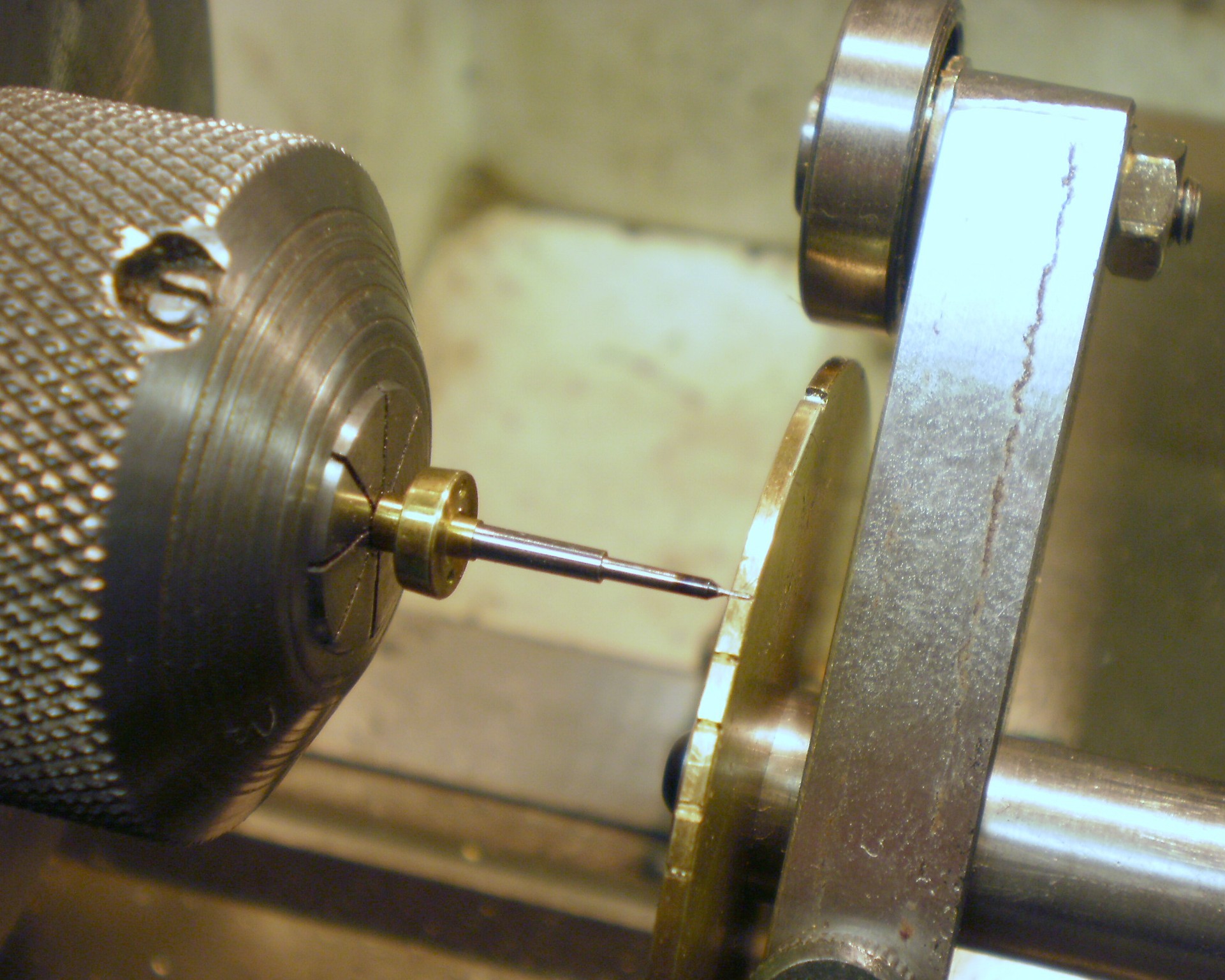 The traditional way of re-pivoting would use a lathe with the staff held in a collet and the staff steadied using a Jacot tool. A graver would be used to turn off the damaged portion and a centre for a drill started using the point of the graver. A hole would then be drilled using a spade drill and a slightly tapered piece let into the hole until it jammed in place in the hole. The pivot could then be cut off to length and finished to size using a graver. This process has scarcely changed in two hundred years, but small machine tools and their attachments are now much better constructed than they were even fifty years ago and it seems to me that we should take advantage of advances. In any case, I am nearing the end of my days and have not the time to learn skills which have been made largely obsolete by modern tools. Professionals who read what follows may disagree with my method, but it does use the skill that has been built into the lathe and employs the lathe slides that can guide a tool far better than I could by hand. It is important, however, that the cutting edge of the lathe tool should be exactly on centre height and this is best achieved by making trial cuts on a piece of pinion wire, closely observed with a magnifying lens.