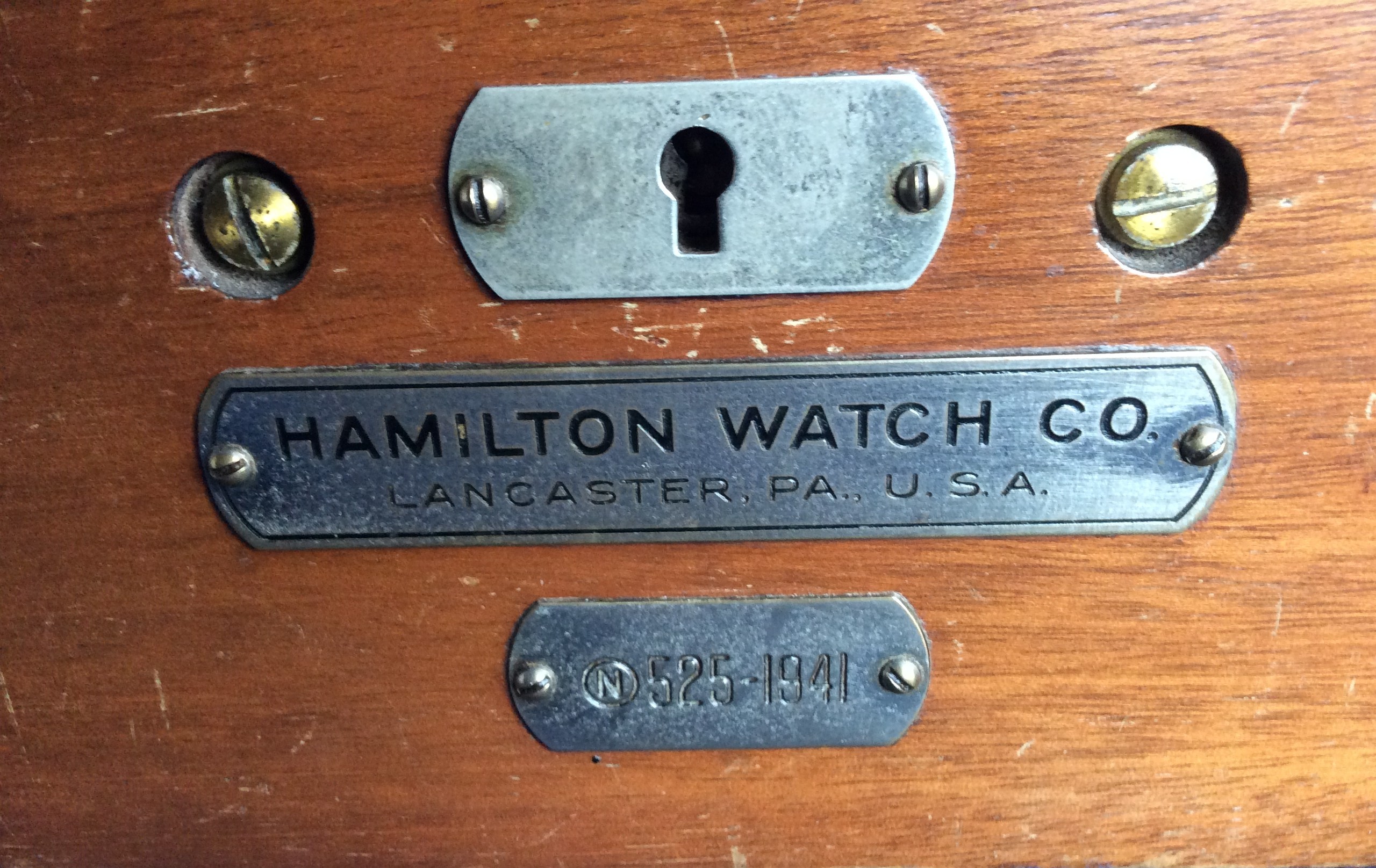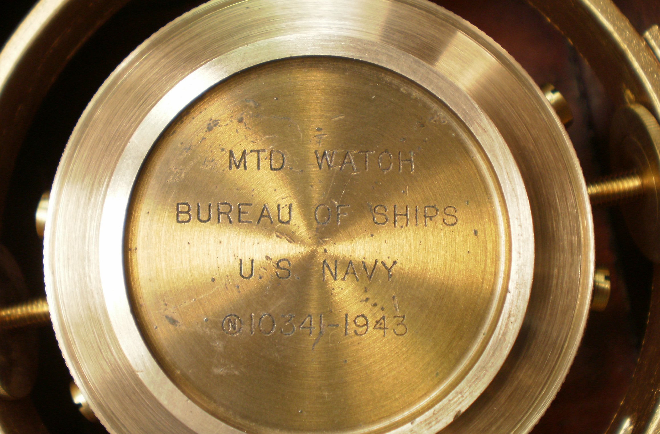 As the Second World War loomed, the United States realised that its navy was going to need a great many chronometers. The United States scarcely had a chronometer industry, and such as were made used parts imported from overseas, mainly from Great Britain. However, the belligerents had no spare capacity to produce chronometers for others, and Switzerland, the other main maker of chronometers apart from Germany and Britain, was in a difficult position: their German neighbour in effect forbade them to sell chronometers to the Allies. The Hamilton Watch Company stepped up to the mark and began delivery of their Model 21 box chronometer with detent escapement in April 1942; By the end of the war, they had delivered nearly 9000 of these very fine instruments. However there was also a great shortage of deck watches, both for larger ships for transferring time from the box chronometer(s) and for small vessels where a chronometer-rated watch had to serve as the principal timekeeper. The Hamilton watch company began delivery of their Model 22 watch in June 1942. By war’s end, 13,531 gimballed watches and 9780 non-gimballed watchers had been delivered. The non-gimballed watch was in the form of a large pocket watch in a rectangular padded wooden case, while the gimballed watch was contained in a small three-part cubical case, like the M21 chronometer’s but smaller at about 51/2 inches on side. A total of 9,780 non-gimballed (Figure 1) and 13,531 gimballed watches (Figure 2) were made.