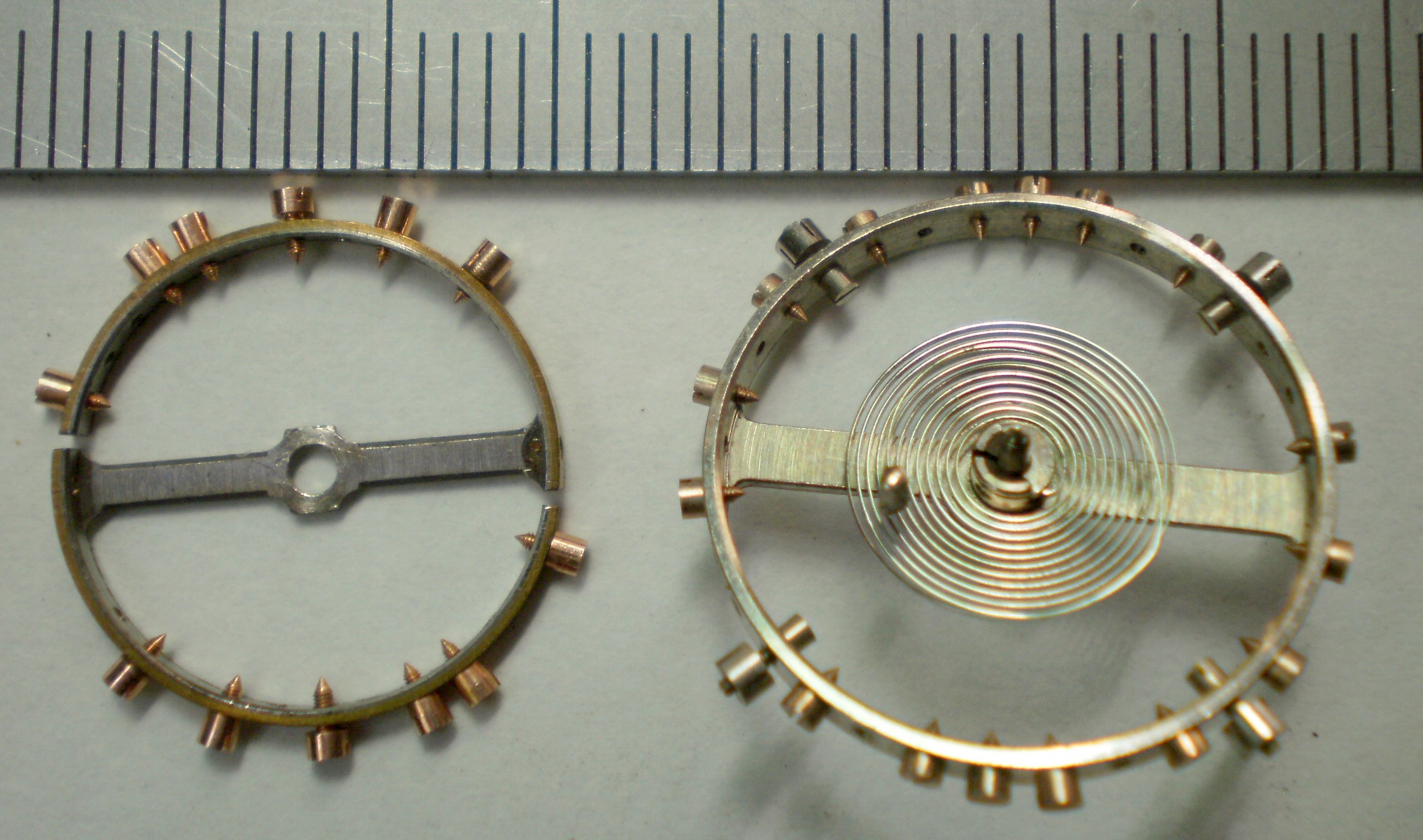 It is in the balance that the M22 differs from usual practice of the time. It uses an ovalising balance of a similar design to that of the M21 box chronometer with a Hamilton Elinvar balance spring with Breguet over-coil. Figure 5 shows on the left a typical pocket watch balance wheel and on the right the M22 balance wheel and spring (the scale is in millimeters).