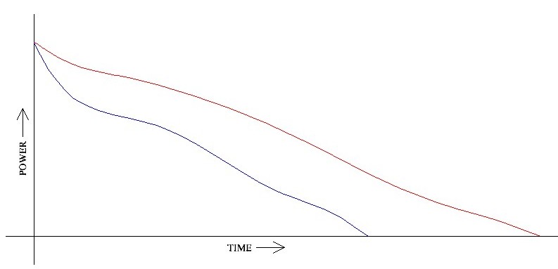 Box chronometers are fitted with a fusee so that a more-or-less constant power is delivered to the escapement. If the balance is isochronous, that is to say it takes as long to make a full swing whether the arc of the swing is large or smaller, then constancy of power delivery to the escapement becomes of less importance. As will be seen later, the balance has design features that make for isochronism and this, combined with the advantage of the watch being maintained face-up at all times, meant that a going barrel was fitted, despite its non-uniform delivery of power. Nevertheless, the M22 was fitted with a mainspring five feet (1524 mm) long which gave a power reserve of over 56 hours, though usually navigating timepieces were wound every 24 hours at the same time of the day. Figure 4 shows in blue how the power declines in, say, a pocket watch going for 36 hours. In the first few hours, there is a fairly steep decline in power which then tends to level off, followed by a steep decline in the last few hours. The effect of lengthening the mainspring so that the watch runs longer is shown in red, with a less steep initial decline, and a lesser rate of loss of power thereafter. Another advantage of a going barrel is that there is no need for maintaining power during winding. The spring fitted to the M22 was 4 mm wide and 0.195 mm thick, with thicknesses of 0.190 and 0.20 also being available as required.