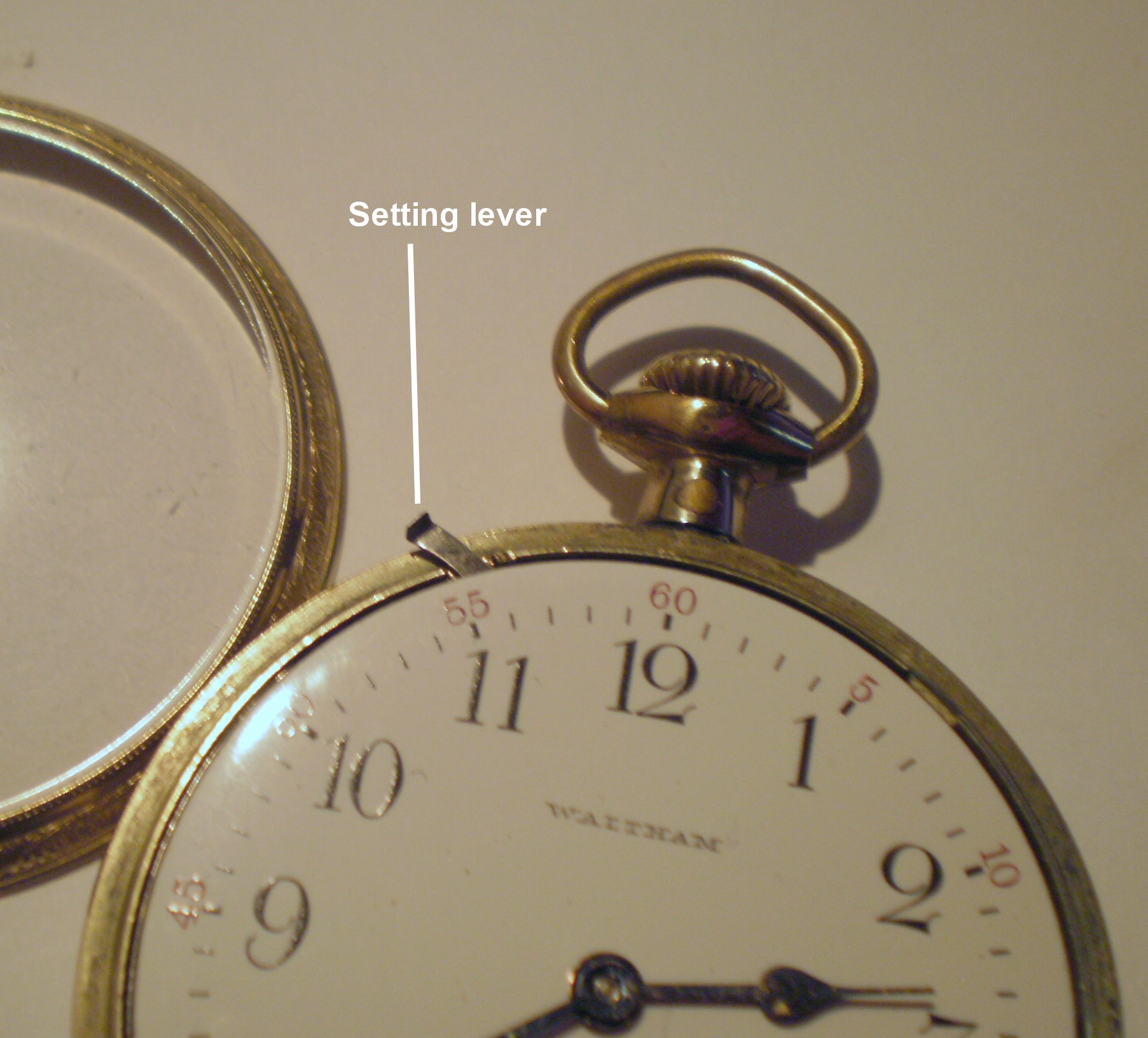 When it was important never to “lose the time”, as for example on railroads and for navigation out of sight of land it was usual to provide some way of preventing accidental re-setting of the hands when re-winding. The American railroad watches were most often lever-setting, that is to say the front glass and bezel had to be unscrewed to expose a tiny lever, which had to be pulled out before the hands could be set (Figure 7), while box chronometer hands were usually reset, to Greenwich Mean Time, at the conclusion of a voyage. The M22 had a safety setting button to the left of the winding button (Figure 8).