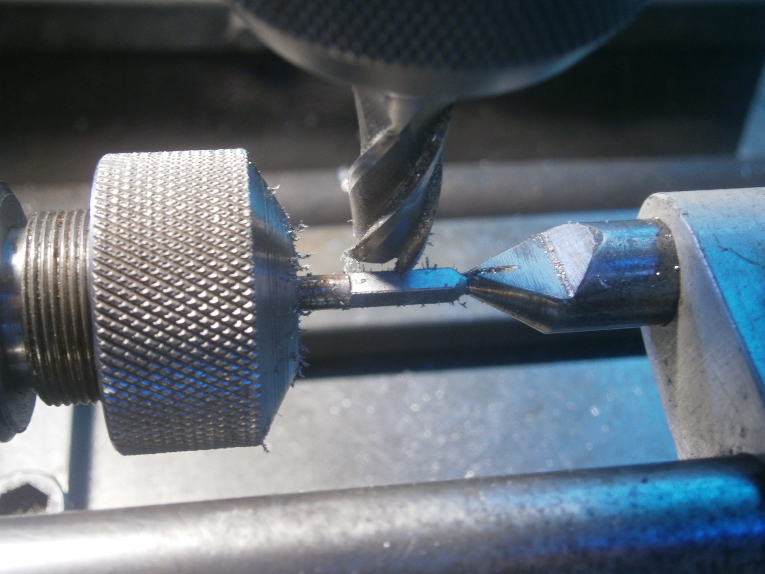 Before being able to machine the remaining arbor, it was necessary to soften the end by heating, while trying to prevent the spread of heat to the rest of the arbor. I did this using a small blow torch while holding the arbor in a vice-grip clamp to act as a heat sink. Once I had done this I was able to face off the end, centre drill it and drill the end 3 mm diameter with a freshly sharpened drill, to ensure as far as possible that the hole would not be oversize due to un-equal sizes of the cutting edges. However, at about 4 mm depth, the drill began to protest as it headed towards the 10 mm diameter and I was forced to stop drilling at a depth of 5 mm, as the centre of the arbor had remained too hard for the drill.