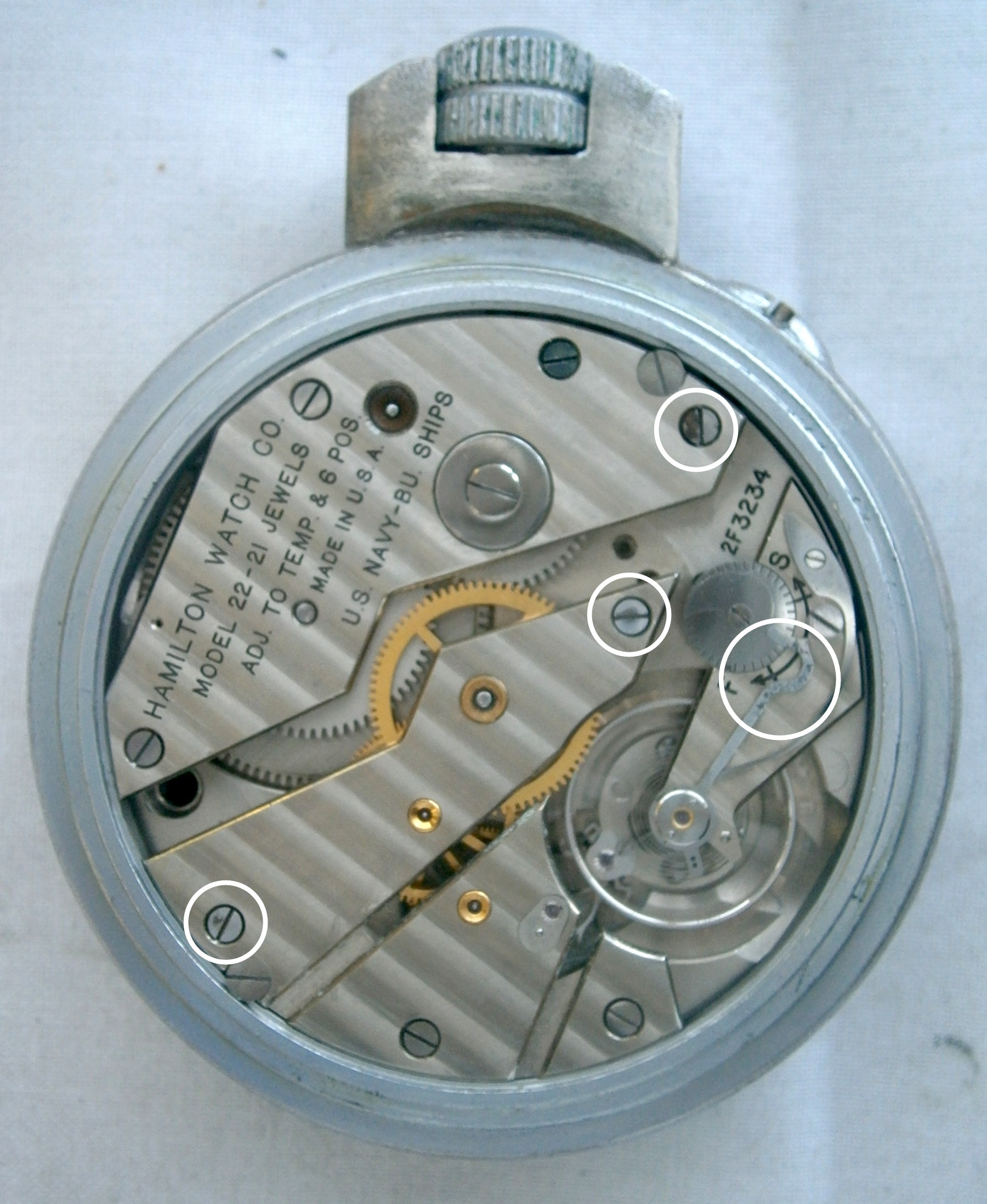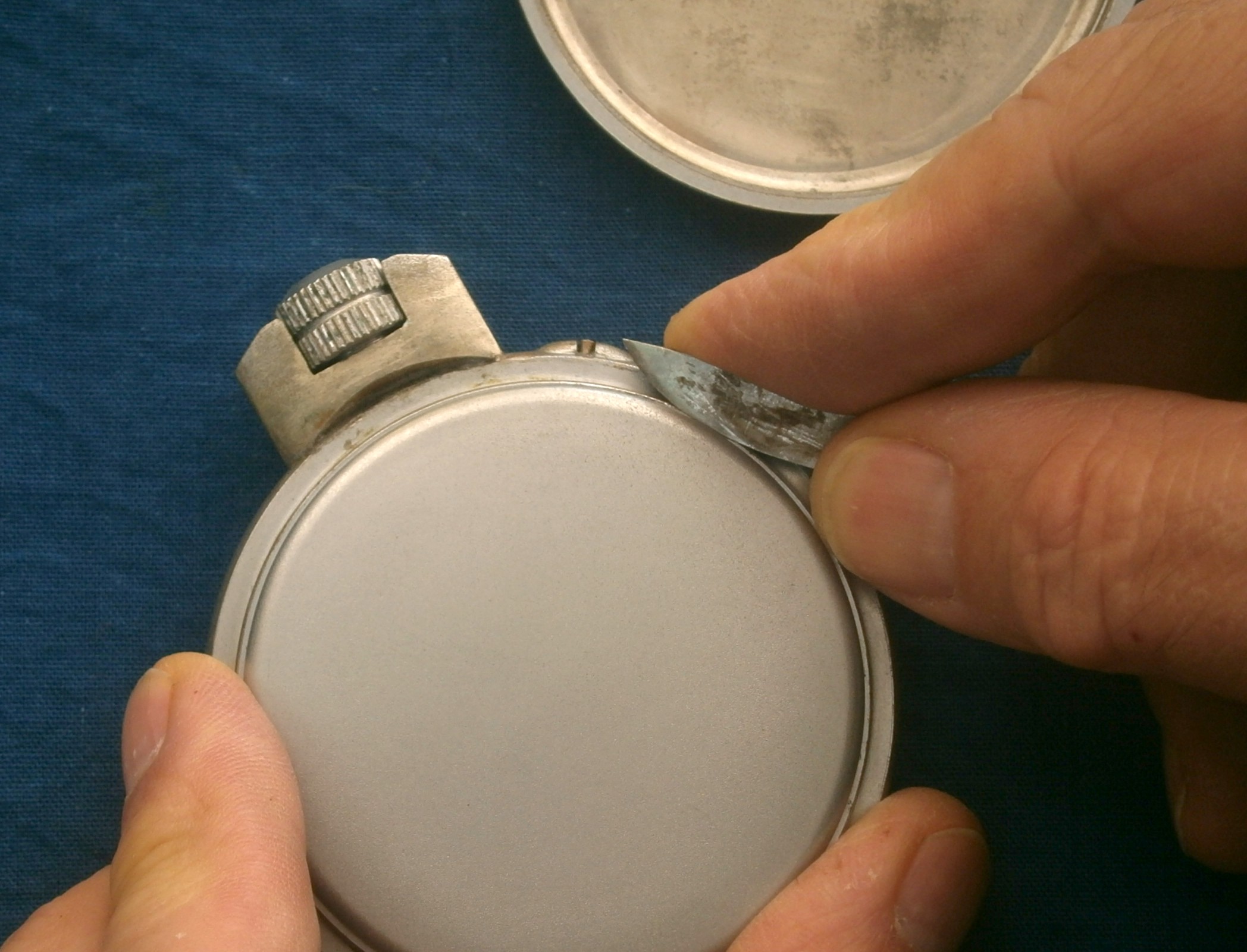 The underside of the screw-on back was black with corrosion, traces of which may be seen on the upper right of Figure 5, posed to show the safe way to remove the underlying snap-on back. The index finger insinuates the edge of the blade under the back by pressing opposite the belly of the blade. Held in this way, if the knife slips, it cannot scoot across the bridges of the movement and scratch them or wreck the balance.