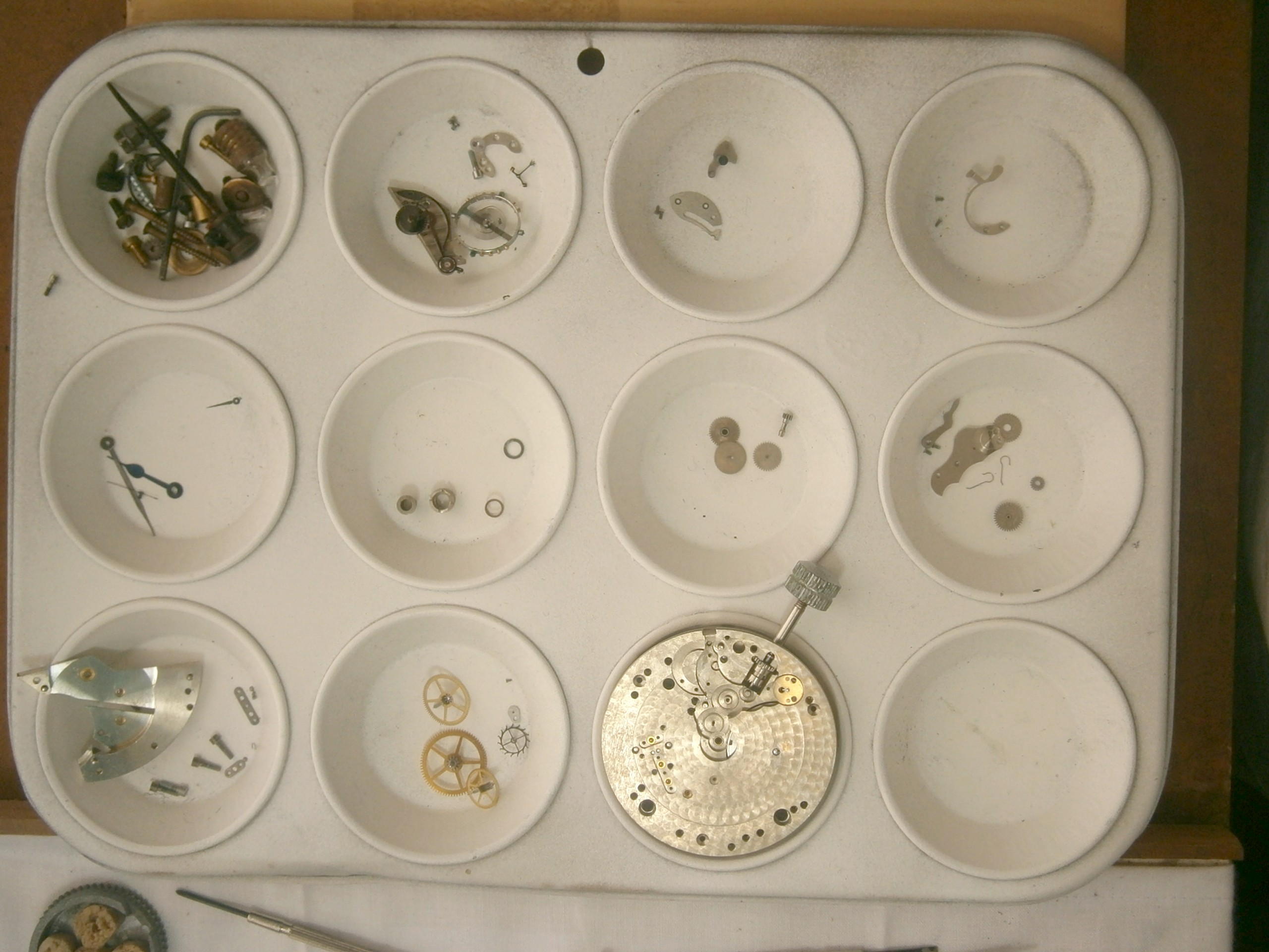 I imagine that by now, any professional watch maker reading this will be shuddering at the anticipation that more brute force was applied, and they will be right, for I was able by using copious releasing compound and careful prying, to make the case give up its grip. After this, all was relatively plane sailing, to remove all the parts and clean them (Figure 9). Note the use of a white painted baking tray to hold the parts in order. The professional who, from long practice knows what everything is and where everything goes, will simply place them in a cleaning machine and get on with something else, and s/he can get away with setting them out on the bench and immediately assembling them. The amateur who leaves the parts on the bench will sooner or later pick something up on the shirt sleeve and lose it, or thoughtlessly rest the edge of a hand on the tiny pallet arm and break it, or the cat will explore…