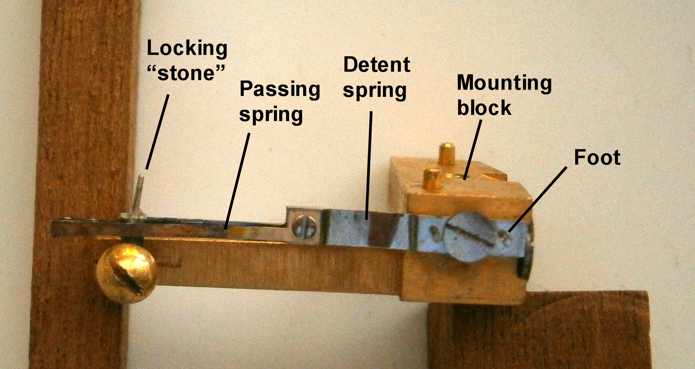I was able to salvage the end stone and I had a spare hole stone, so I made a muff to replace the missing pivot (see Post 7 of July, 2013) and all was well with the escape wheel. Interestingly, A L Rawlings in that fine book, “The Science of Clocks and Watches,” writes of having owned a chronometer which had gone for a hundred years from 1840 without showing any wear on the impulse face of a steel impulse roller, but since I had a spare jewelled impulse roller, I used it. By drawing the buckled detent spring repeatedly between my finger nails I was able to restore it to something like a functional shape, with no warping, and observed in passing that the passing spring was an original fitting.
