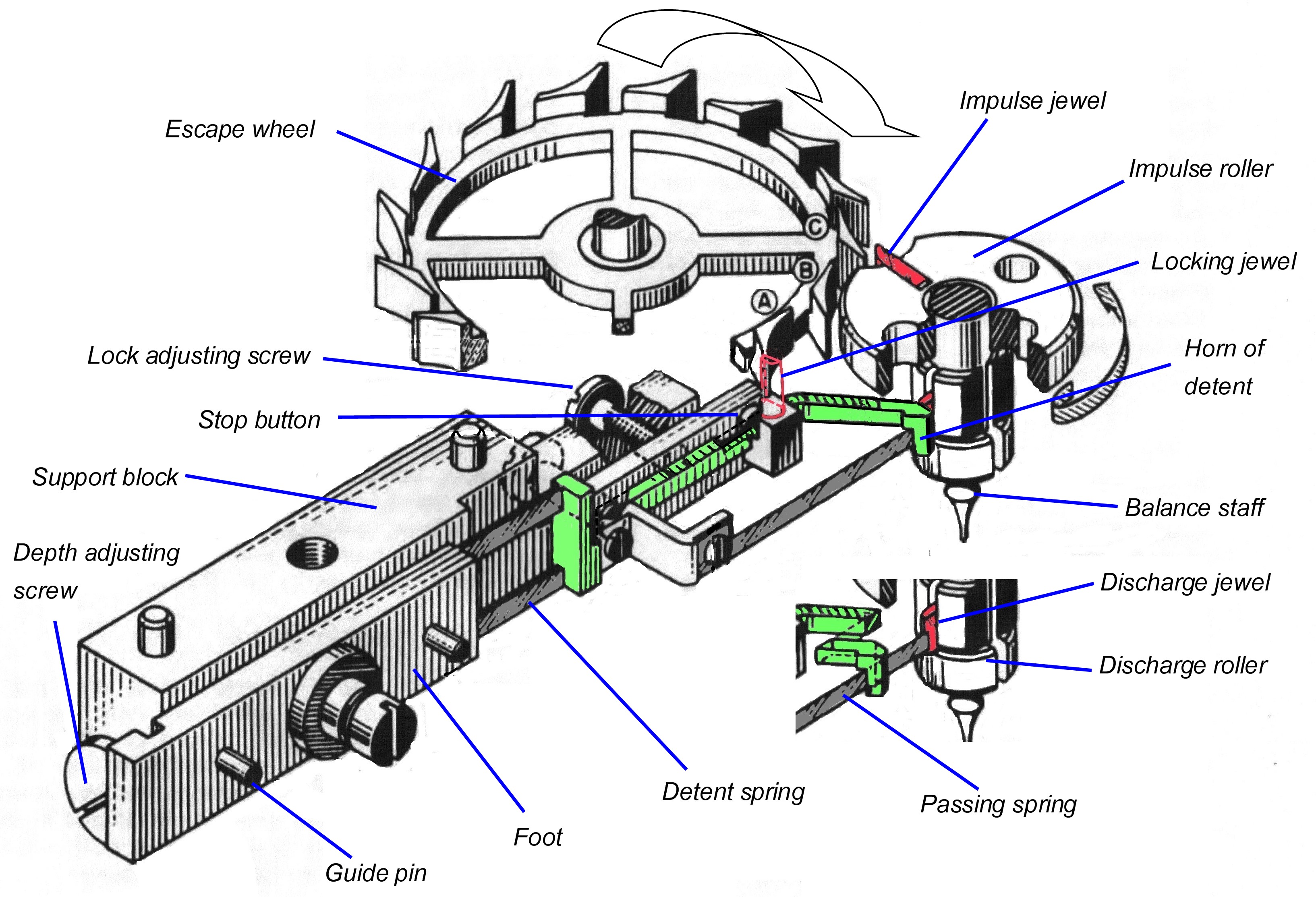 A foot is attached to a support block with a screw and washer. Two guide pins engage in a groove in the support block and allow only longitudinal movement when the depth adjustment screw is turned. This adjustment determines how deeply the passing spring engages with the discharge jewel, which in turn determines for how long the locking jewel is lifted out of the path of the escape wheel teeth. If it is out of engagement for too long, locking on the next tooth may fail and the chronometer is said to trip. It will then go twice as fast as it should. The support block allows the detent to be removed from the chronometer and replaced without disturbing its adjustment in relation to the rest of the escapement.