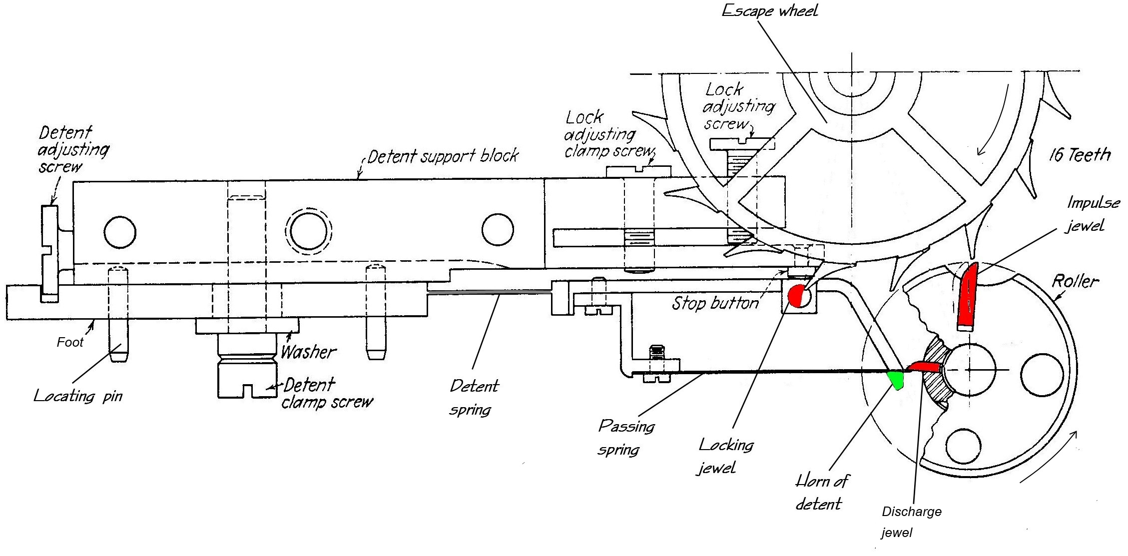 The slender and flexible passing spring is mounted on a Z-shaped bracket. However, it must not be so flexible that it cannot cause unlocking, nor should it be so strong that on resuming its seat on the horn of the detent the percussion causes the locking jewel to release a tooth. The lock adjusting screw determines the position of the stop button which in turn determines how deeply the locking jewel engages with the escape wheel teeth. It must be deep enough to lock despite any shake in the escape wheel bearings. Depth of the passing spring and lock, and the angular position of the discharge jewel in relation to the impulse jewel are interdependent; if any one is disturbed, the others may need to be adjusted to regain an efficient action of the escapement. The official Manual for Overhaul, Repair and Handling of Hamilton Ship Chronometer explains in detail how to carry out adjustments for the Model 21 and Appendix 1 of my The Mariner’s Chronometer does so for chronometers in general. Without a clear understanding of the action of the escapement and the effects of individual adjustments, one is best advised to leave well alone, and if the instrument has fallen out of adjustment through wear or accident, expert help and wide experience may well be required to put it right.