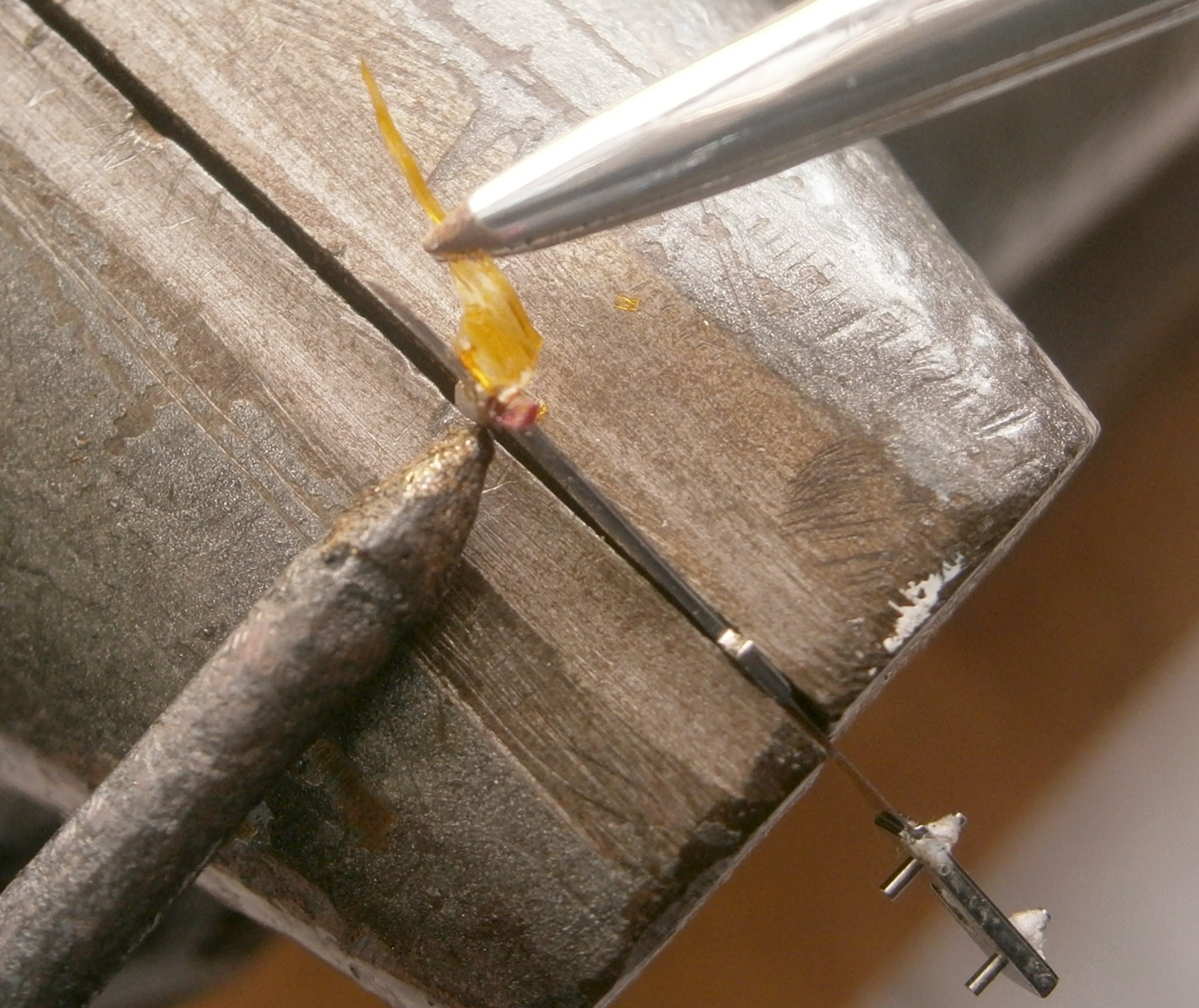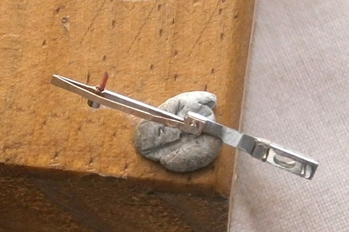 The finish left by a 400 grit wheel, although fine by normal standards, won’t do for clock work and has to be lapped and polished. I did this by hand, holding the cylindrical part in a pin vice with just the flat part projecting and resting it on a piece of metal of a thickness such that the handle of the vice lay on the table while the part with the flat was supported by the metal. (Figure 4).